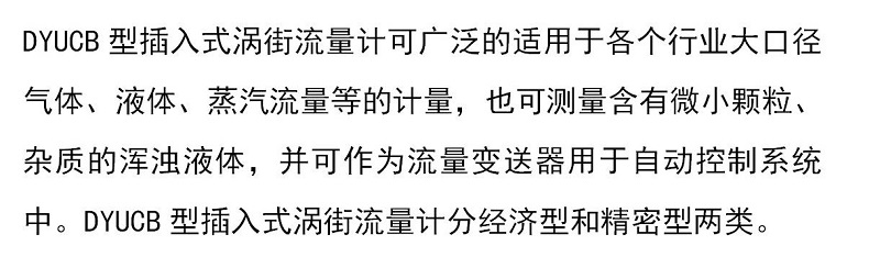 DYUCB型插入式涡街流量计可广泛的适用于各个行业大口径气体、液体、蒸汽流量等的计量,也可测量含有微小颗粒、杂质的浑浊液体,分经济型和精密型两类。